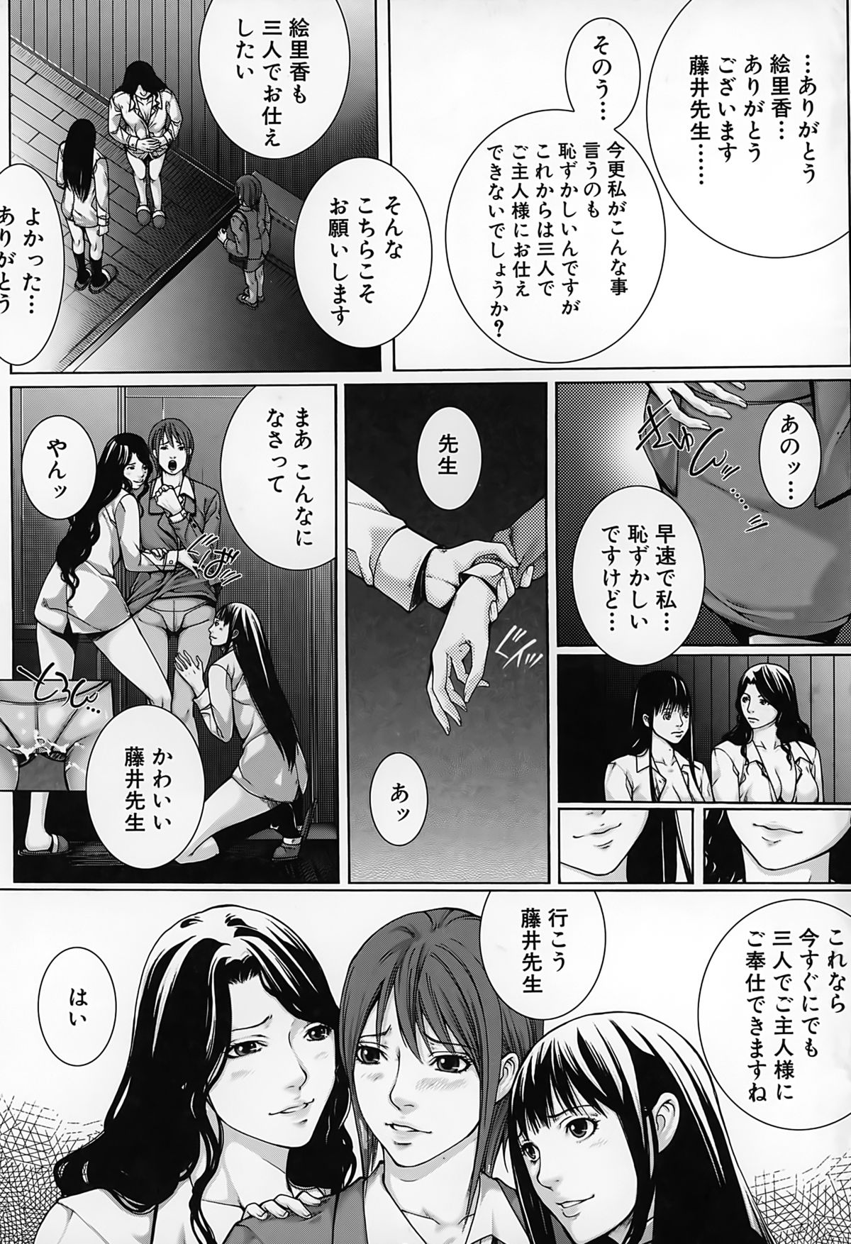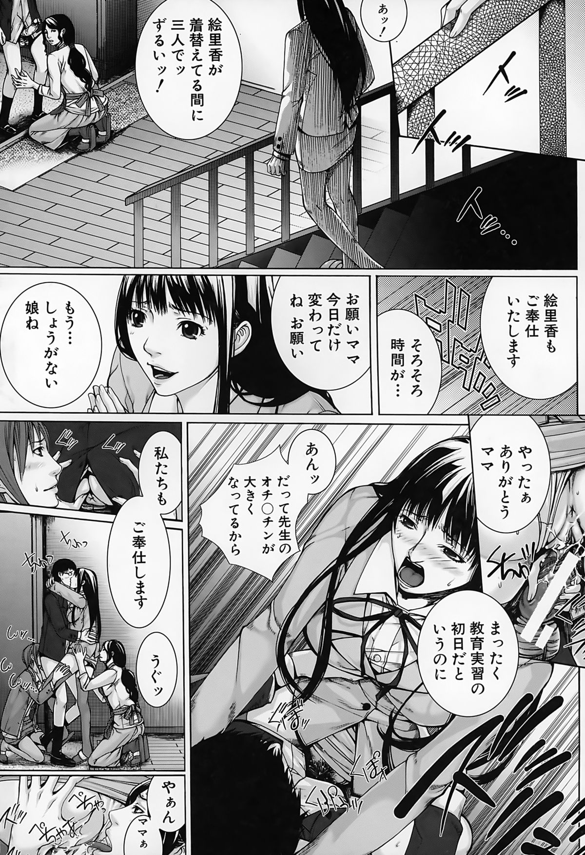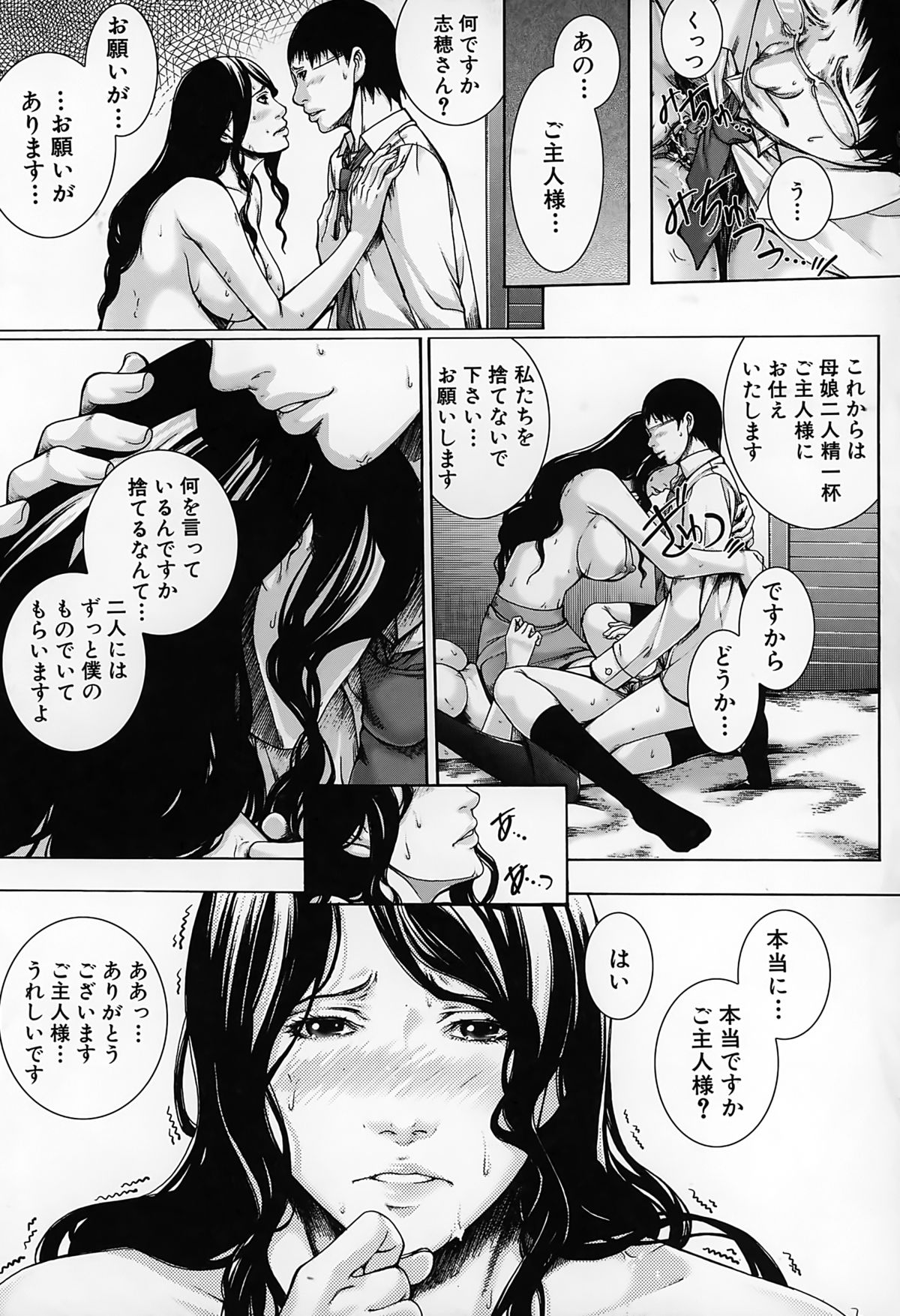 【エロ漫画】JKの母親同伴で、JKの巨乳を堪能したり母親にフェラチオされて口内射精する先生。JKに自分で処女喪失させて騎乗位セックス。母親も参加してきて、爆乳を揉みしだきながら母娘丼3Pセックスして皆で絶頂。母娘と女教師の三人を性奴隷にして、皆に奉仕させてハーレムセックス!【ハスミヒロ:M³】